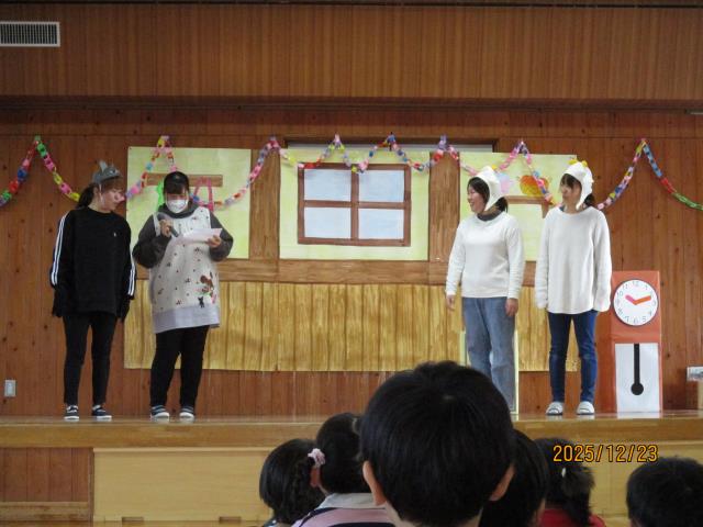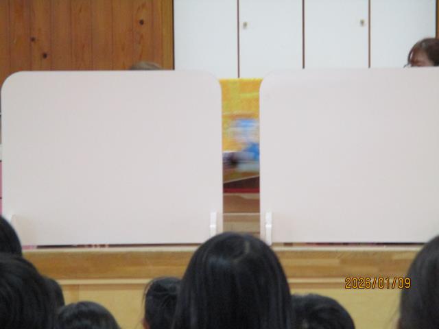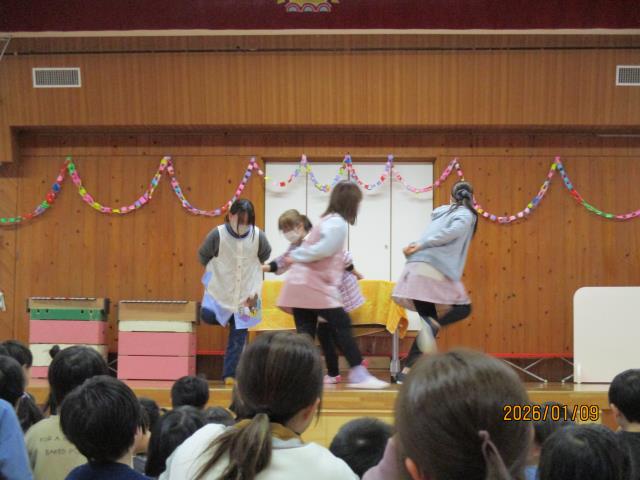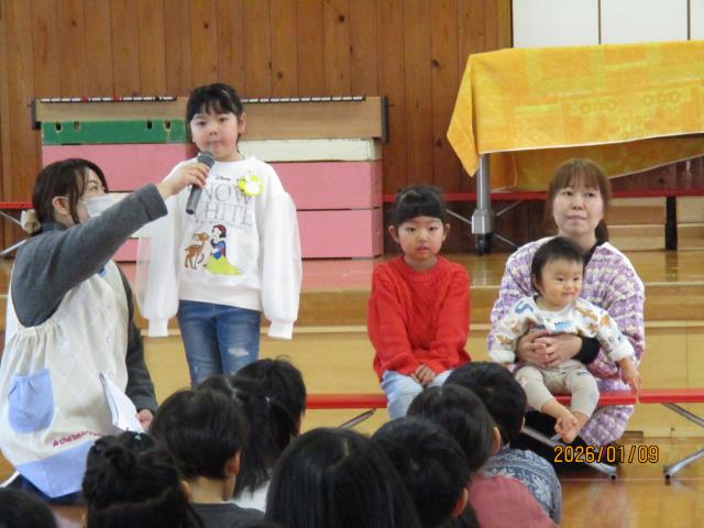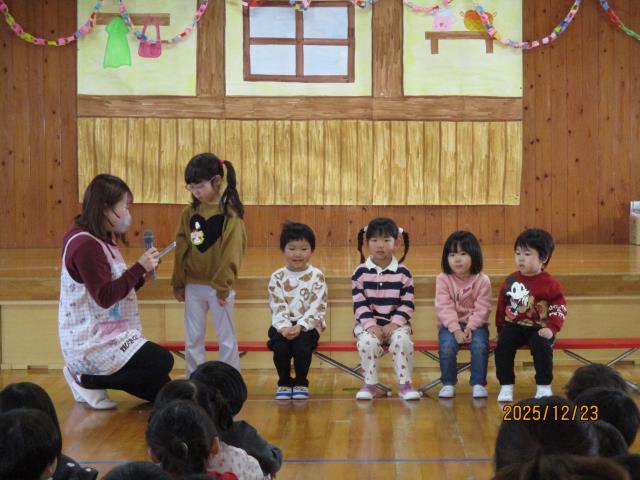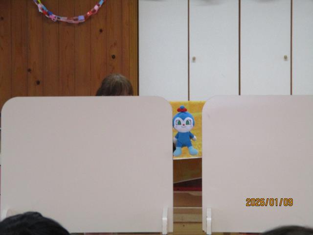 9日(金)、新年お楽しみ会とお誕生会がありました。新しい年を迎え、新年会も兼ねて行いました。今月は3名のお友達が主役でした。お誕生日に食べたケーキや大きくなったらの夢を上手にこたえてくれました。ディズニープリンセスが人気で、ケーキやプレゼント全部がプリンセスのものだった子もいました。また、ぴよぴよチームのお友達もみんなの前でにこにこかわいい笑顔を見せてくれました。今回のお楽しみ会は新年会も兼ねていることから盛りだくさんでした。「これな~んだ?クイズ」では、ついたてとついたての間を通過する物を当てました。よ~く見ていないと分からないほど速く通過していきましたが、子どもたちは目がいいようで正解する子もいました。そしてその後は、職員による「ジェスチャークイズ」!。演者の先生方が上手すぎて~、大いに盛り上がりました!問題の中に答えが「パシュート」というものがありましたが、さすがに子どもたちには難しく…(笑)「スケート」とこたえてくれた子はいました(笑)みんなで楽しく過ごし、笑顔がいっぱいの会となりました。