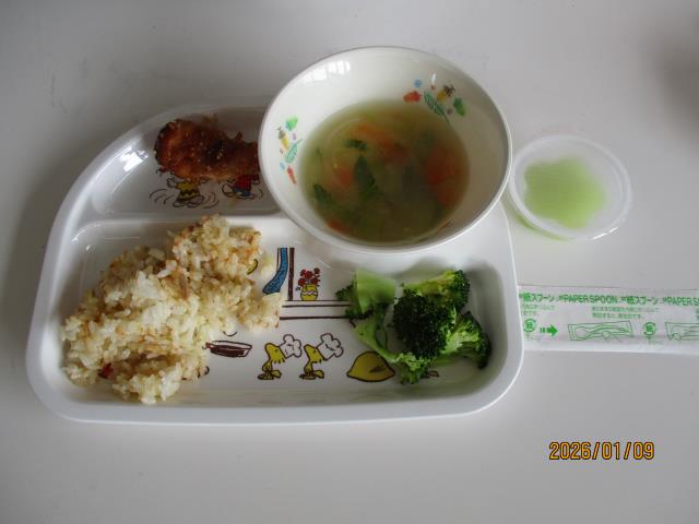 さて、今回のお楽しみ会は「とうめいくんと魔法の水」の色水シアターを見て楽しみました。透明の水に魔法をかけると赤、青、黄色に色が変わり・・・その様子に「わぁ~!」と不思議な表情と同時に歓声がわいて大喜びしながら見ていた子どもたちでした。また、赤に青を混ぜると紫色に、青に黄色を混ぜると緑色に、黄色に赤を混ぜるとオレンジ色になる変化にまたまた「わぁ~!」「お~!」の歓声で大興奮でした。色の変化に驚きっぱなしの子どもたちでした。本当に魔法を信じてくれる子どもってかわいいですね♡お楽しみ会後は、給食!!ごちそうにも満足そうでした。