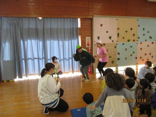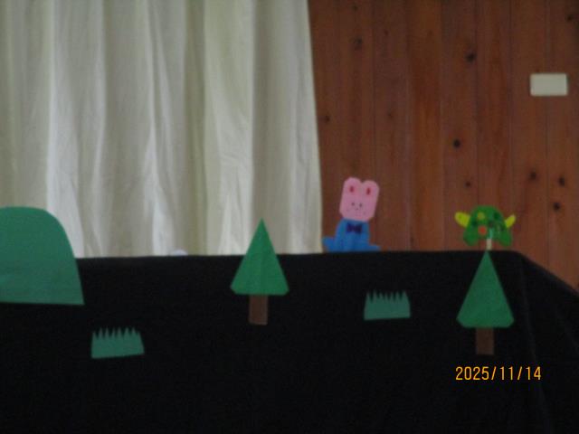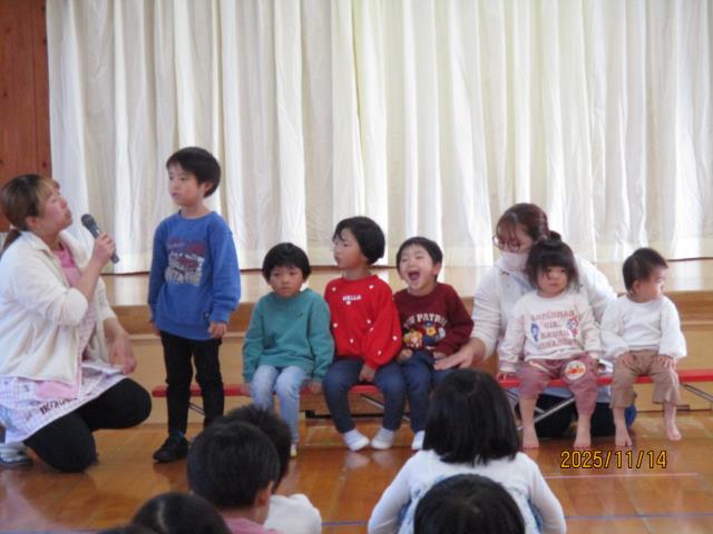 14日(金)に11月生まれのおともだちのお誕生会がありました。この日を楽しみに待っていた誕生児のみんなは笑顔で登場!インタビューにも上手にこたえてくれました。お誕生日の日には、手作りケーキやショートケーキを食べたこと、大きくなったら自衛官、消防士、プリキュア、ウルトラマンなどになりたいとお話してくれました。そして集まったお友達から「おたんじょうびおめでとう」とお祝いしてもらい嬉しそうにしていました。今回のお楽しみ会は「うさぎとかめ」のペープサートでした。おなじみのお話のペープサートかと思えば、途中から実写版となり、T先生のうさぎとH先生のかめが登場しました。お遊戯室いっぱいを使っての名演技に笑いが止まらない子ども達でした。当日欠席のお友達もいましたが、楽しいお誕生会となりました。