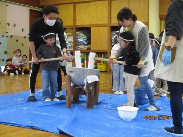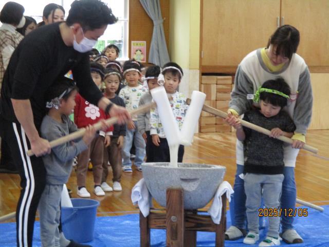 今日(12/6)、みんなが楽しみにしていたもちつき大会が行われました。11月末からどのクラスからも聞こえてきていた「もちつき」の歌!本番はいつもに増して気合を入れて遊戯室に響き渡る声で歌っていました。歌が終わるともち米が登場!つく前に蒸したもち米を見せてもらってからもちつきが始まりました。初めは副園長先生とまさみさんについてもらい、ぺったんぺったんの迫力と音にびっくりする子も中にいましたが、力強くつく副園長先生とまさみさんの頑張る姿に「がんばれ~」の声援も送っていた子どもたちでした。おもちになってきたら子どもたちの出番!ことりチーム、うさぎルーム、こあらルーム、らいおんルームの順で小さい杵を持っておもちつき体験をしました。みんな自分の番になると喜んでついていました♫ぴよぴよチーム、かるがもチームは、先生に抱っこされながら臼の中のおもちを見たりしました。