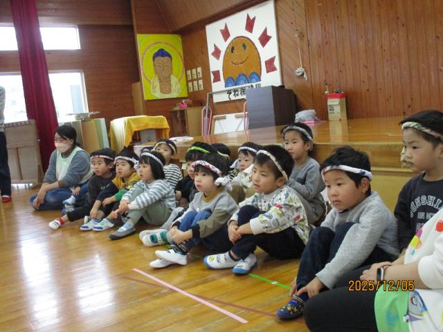 最後は「うれしいひなまつり」の歌に合わせてみんなで歌って踊りました。女の子のお祝いということで年長の女の子に前に出てお手本となってもらいました。ちょっと恥ずかしそうにでも、可愛らしく踊っていました(^^)手を返したり、上下させる動きがとても優雅で可愛いのです