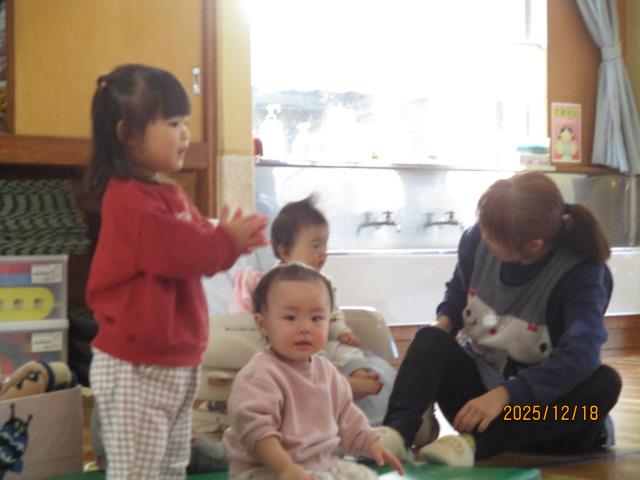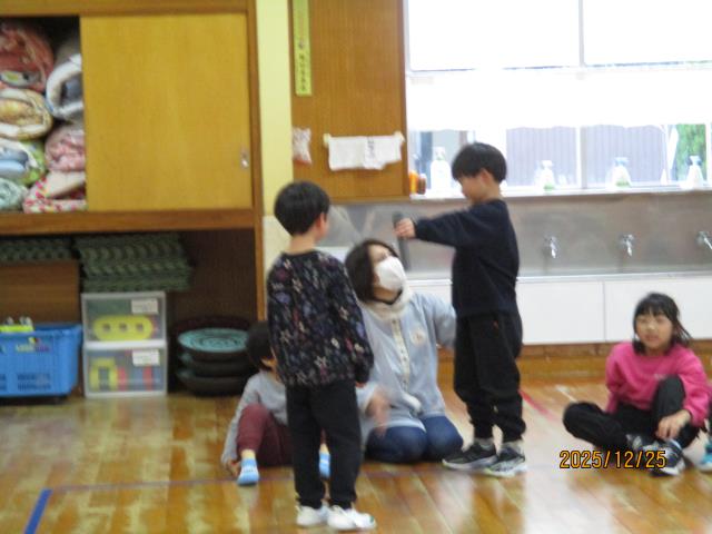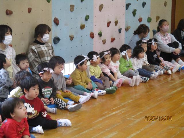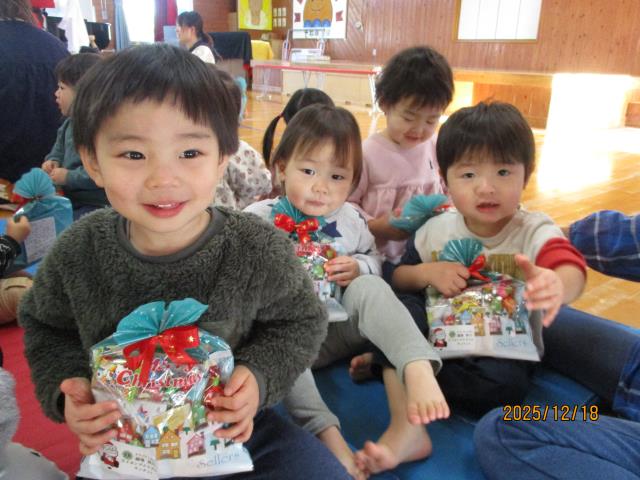 サンタさんからいただいたお菓子は食べましたか?お子さんからお話は聞いたかと思いますが、19日(木)に一足早くライオンズクラブのサンタが曽根おひさまこども園に来てくれました。サンタさんの姿に大興奮の子どもたち。しかし、小さい子の中には不思議そうに見ていた子もいましたが…(笑)