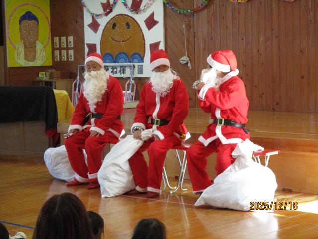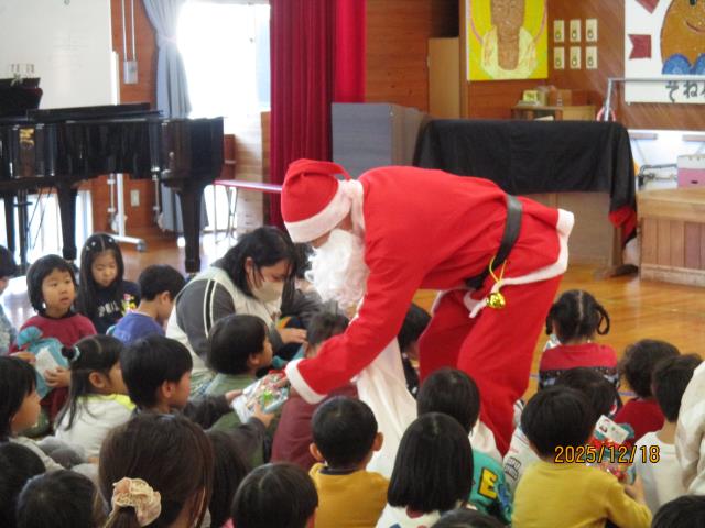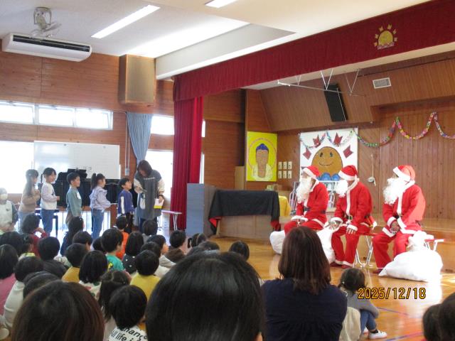 本日18(木)、ライオンズクラブのサンタさんがこども園に3名来てくださいました。サンタさんの登場に大喜びの子どもたち。小さい子の中にはびっくりして泣いてしまった子もいましたが、会が始まるとみんなが集中してサンタさんに注目していました。まずは、サンタさんへの質問タイム。らいおんルームの代表者がいくつかの質問をしてくれました。「好きな食べ物は?」の質問には「果物です」とこたえてくださいました。もう一人のサンタさんはケーキが好きだそうです。そして、その次は、みんなで♪あわてんぼうのサンタクロース♪を歌いました。みんなの元気な歌声にサンタさんは元気をもらいましたと嬉しそうにおっしゃっていました。それを聞いてみんなも嬉しそうにしていました。そしていよいよお待ちかねのサンタさんからのプレゼントタイム!大きな袋からおかしのプレゼントが…。1人ずつサンタさんからいただいて、興奮ぎみの子どもたちでした。最後にらいおんルームさんがお礼にサンタさんへメダルを贈りました。サンタさんはたくさんのメダルを首にかけて、「また来年会いましょう」と帰っていかれました。サンタさん、ありがとうございました。来年も元気にお待ちしていまーす!